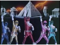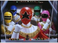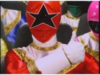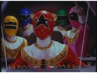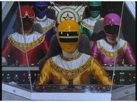 Red Ranger holds his fist up, as gold lightning crashes behind him and his visor gleams red. Zoom out from the five Rangers as they motion arms about and reach for the sky with one arm each, releasing respective colored energies from their hands, the dark backdrop flashing into their monochrome Zord basis statues. As they fade, the background flashes and turns into a golden rain, the Rangers changing into battle stances. |