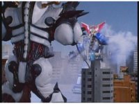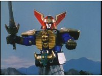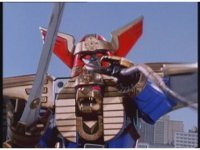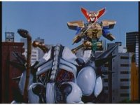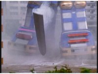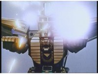 As the Rangers watch in foreground, Red Battlezord shines with a golden light, causing Main Drain to break off tail connect and fall over. |