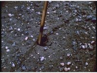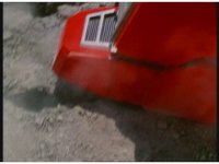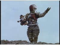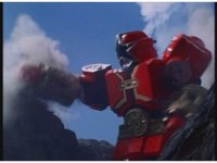 Close-up on Red Battlezord's right arm, lowering, causing the dirt pile upon it to fall to the ground. |