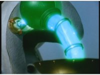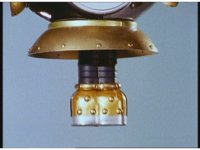 Close, side shot, as Orbus remains connecting to Silo's hole, greenish energy rising up his extended neck pipe, causing his head to glow and for the mouth tube to inject this power into the monster. |