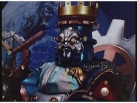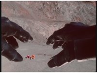 Quick pan up to King Mondo on edge of cliff, talking and slamming down staff base. |