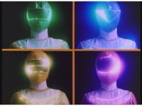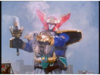 Close-up on Zeo Megazord's head as the Zeo Two Battle Helmet slides down over it, flashing happening just off-frame. |