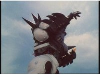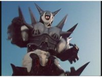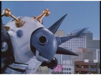 Close on Main Drain's big spikey head, when the little other four Rangers rush in at near distance, firing upon the monster, causing him to crackle with yellow electricity and turn to them. |