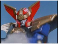 A golden light still flashing off-frame, Red Battlezord slowly rises up, spreading arms calmly. |