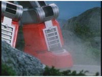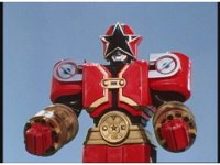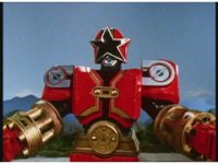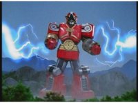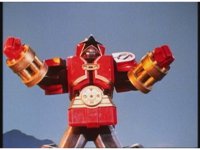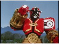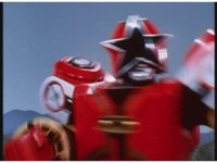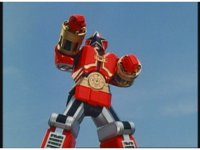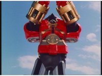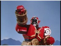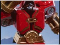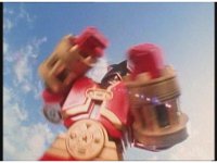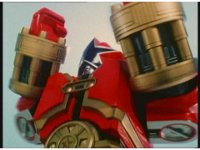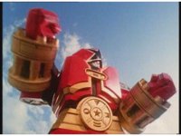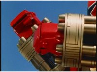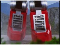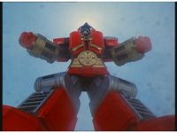 Close-up, side angle, as Red Battlezord holding fists forth into battle ready stance. |