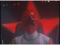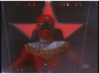 As Red Battlezord lowers arms, zoom in sharply on its visored face. |