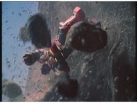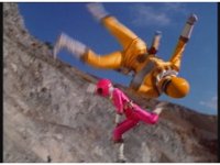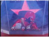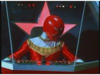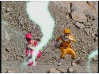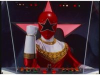 Red Battlezord cockpit flashing and shaking repeatedly, Red finally collapses over, reaching forth across console, clenching fist. |