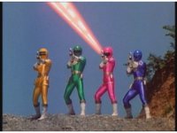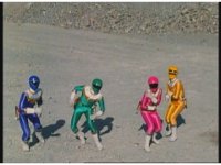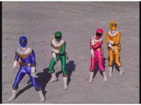 The four Rangers witness the destruction of the monster, then turn our upper right and express their excitement at their leader's success. |
