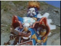 Close on Red Battlezord, lights flashing rapidly, going wild with the arm upper-body jerking. |