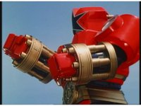 Close, side angle, on Red Battlezord's fists pistoning in and out while unleashing golden laser bolts from its gauntlets. |