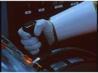 Close-up of Zeo Ranger's gloved hand placing Zeonizer Crystal into round space on control console, releasing it and it begins to discharge golden beams of light straight up. |