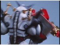 Main Drain and Red Battlezord meet in middle of battlefield, the Zord immediately throwing punches and kicks in rapid succession. |
