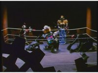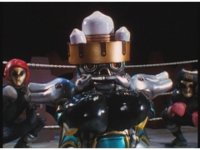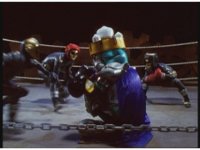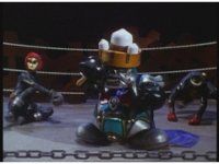 Punch-a-Bunch again knocks Red Battlezord into corner post, Sprocket hits the switch, and gives it a shock. |