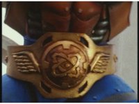 Close-up on Punch-a-Bunch's golden Machine Empire crested championship belt. |