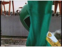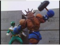Punch-a-Bunch breaks out the sledge hammer, which gives him a brief advantage. But fed up with this, Green leaps up and does a flying punch that takes the monster down. |