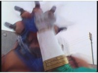 Close on Klank, making punching gestures and hitting self in the head with boxing gloves on. |