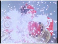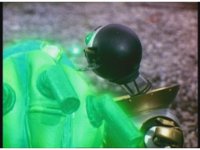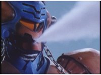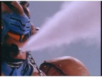 Red Battlezord is sprayed in the face by the white mist, stunning it. |