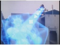 Rocky calls for Zeo Ranger 3, Blue, as said color energy flashes about, a green grid overlaying on his body. The rising energy covers him completely, becoming the Blue Zeo Ranger, visor and costume circuits shimmering with power. |