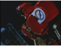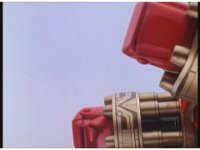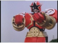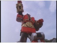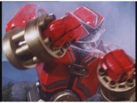 Zoom in on Red Battlezord, holding arms in battle ready stance. |