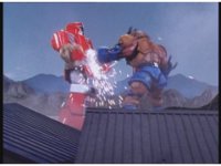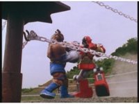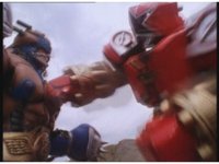 Punch-a-Bunch boxes with Red Battlezord, evenly matched, some kicking involved, but eventually Red begins to succeed. |