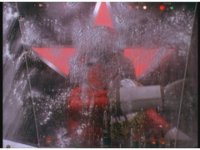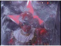 Inside Red Battlezord cockpit, the front window is caked with white frost, Red unable to see through it very well. |