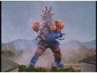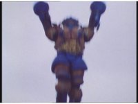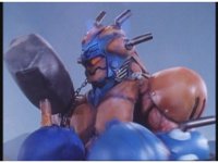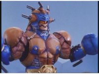 Close on Punch-a-Bunch flexing arms across chest and spreading them briefly, before marching in to fight. |