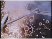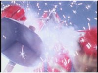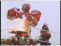 In the Red Battlezord cockpit, the whole place shakes violently and erupts in sparks & smoke. |