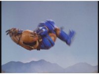 In dramatic slow-motion, Red Battlezord leaps up into the air, and spreads its body out, fists forth. |