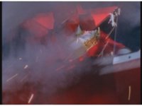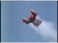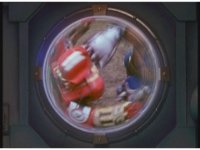 Red Battlezord is launched from cannon at Zord hangar, into a speeding twirl through the sky. |
