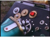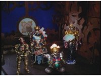 Side angle, on King Mondo near gear-wall, as he turns from our left and gets close on us, saying something with a motioning of his arms, while Prince Sprocket watches, and Queen Machina jerks about in a manic fit. |