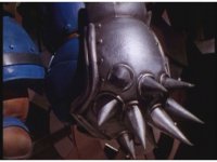 A pair of spiked metal gauntlets lower down over and onto Punch-a-Bunch's fists, he pounds his repaired fists together eagerly. |