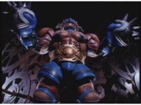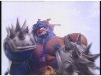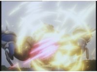 Zoom out, as Orbus hovers above Punch-a-Bunch, and releases a bluish energy beam from his chest plate, causing the monster to stand up, glowing blue. |