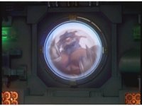 Close-up on Zeonizer, the golden disc thing pops up, releasing a shimmering green light. |