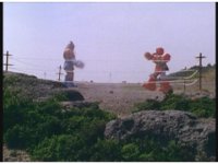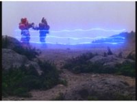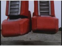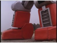 Ground level, as Red Battlezord's feet land, knocking up dust around them. |