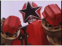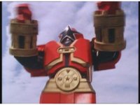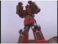 Zoom out as Red Battlezord spreads arms, then punches right arm into the air, holding it there above. |