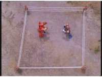 Up against the ropes, Red Battlezord is stunned as Punch-a-Bunch beats on it. |
