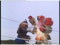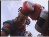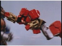 Close, side angle, on Red Battlezord's fists being held ready. |