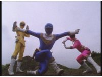 Yellow, Blue, and Pink Rangers do the two-stance pose. |