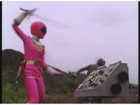 Kat calls for Zeo Ranger 1, Pink, as said color energy flashes about, a green grid overlaying on her body. Briefly, we cut to an outstretched arm morphing into a gloved Zeo Ranger hand. Cut back to Kat, as the rising energy covers her completely, becoming the Pink Zeo Ranger, visor and costume circuits shimmering with power. |