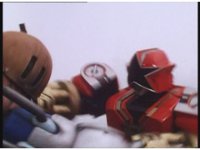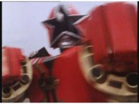 Pan up as Red Battlezord also makes with the fancy footwork, bopping fists together, ready to scrap. |