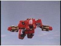 Red Battlezord, spins through the sky, as a red streak beams in upon it. |