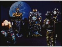 In the Zeo MegaBattlezord cockpit, the team takes a quick look, Red raises a fist briefly, nod-talks and sits back, prompting his four teammates behind him to all motion their right hands up into the air at once. |