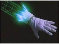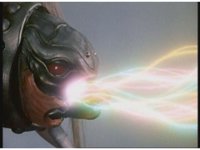 Close-up on Red Battlezord's right fist, still pistoning in and out while unleashing golden laser bolts from its gauntlet. |