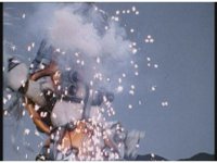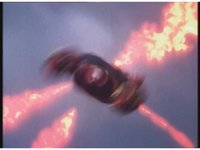 Red Battlezord is launched from cannon at Zord hangar, into a speeding twirl through the sky. Includes zoom in on computer screen with a bunch of numbers and letters on it. |