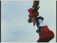 Pan up as Red Battlezord lands, spreads arms, then punches right fist skyward in triumph. |
