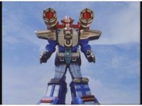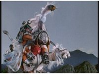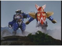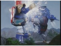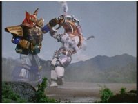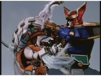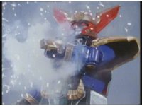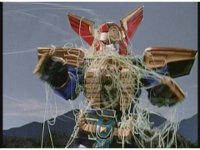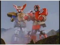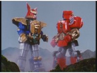 Zeo Megazord & Red Battlezord come together, with golden flashing, to form the Zeo MegaBattlezord. |
