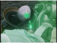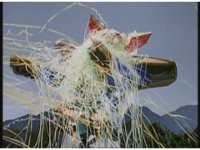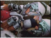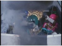 Silly string coating the Zeo Megazord cockpit window, zoom in as Red talks into his left wrist. |