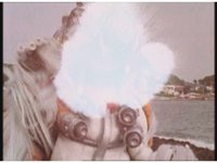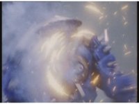 Close-up, side angle, on Autochthon's face as he spews multi-colored string energy to our right. |