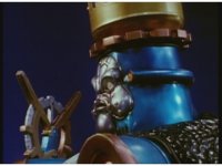 Reverse angle, King Mondo talking at us, while the Orbus-holding Klank in the background takes off a headset, nodding and pointing in response, until the King turns around. |