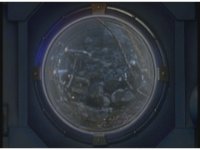 Push forth and pan up along the orangey surface of the moon, stopping on a far exterior of the Machine Empire Skybase against the profile of the Earth. Quadrafighters walking to our right, others flying to our left in the distance, Gearships hovering about,and a group of Cogs walking on some scaffolding. |